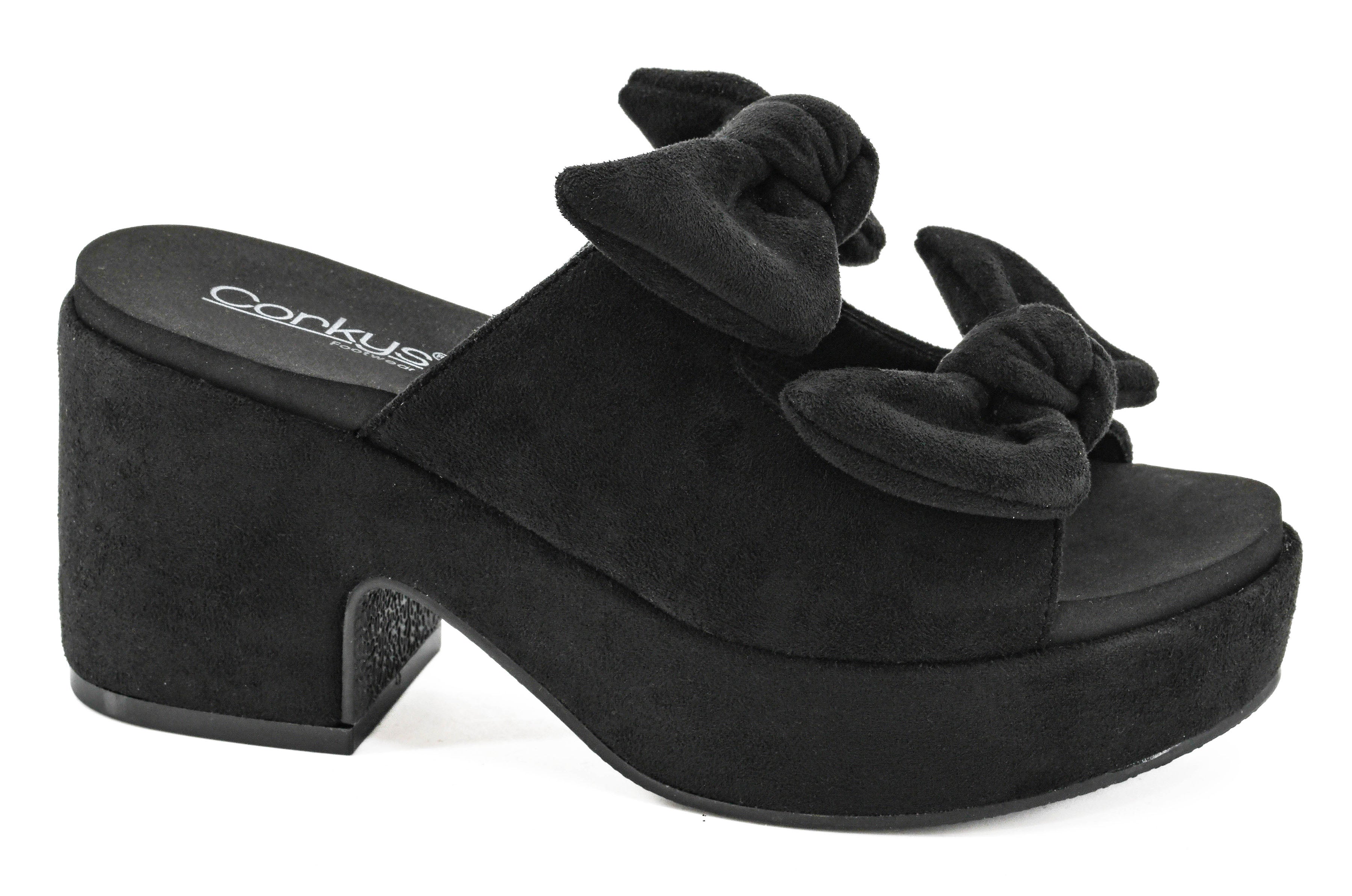 Black faux suede upper with double bow accents