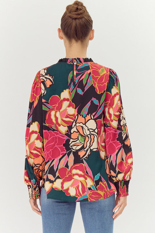 Bold Floral Ruffle Neck Blouse