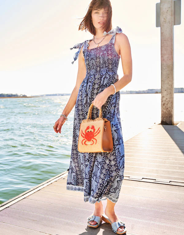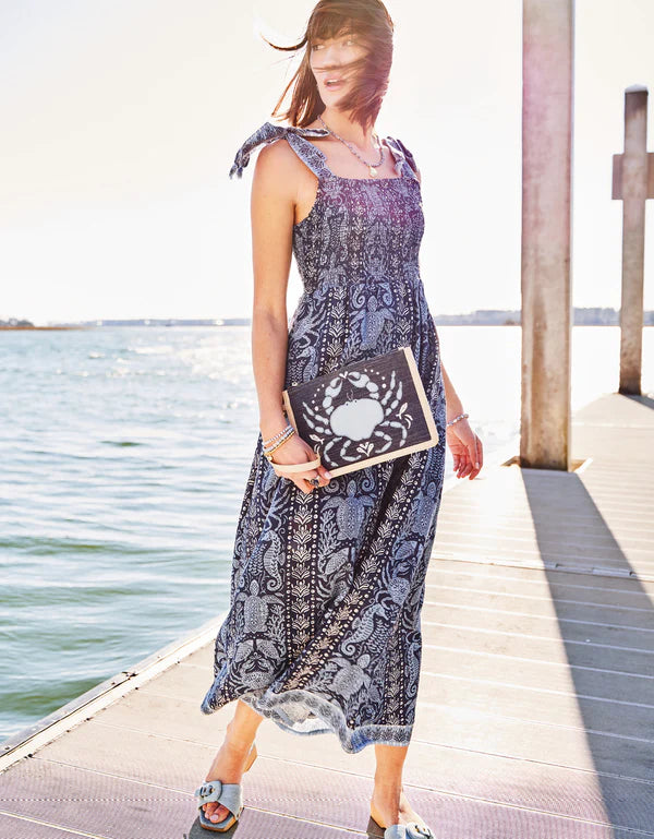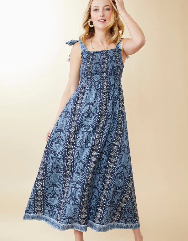 Made in soft, flowy cotton blend that moves with the coastal breeze under a ruched top, our Saylor Resort Midi Dress is vacation ready in a blue sea life print featuring pockets, ruffle details, and adjustable tassel tie straps!