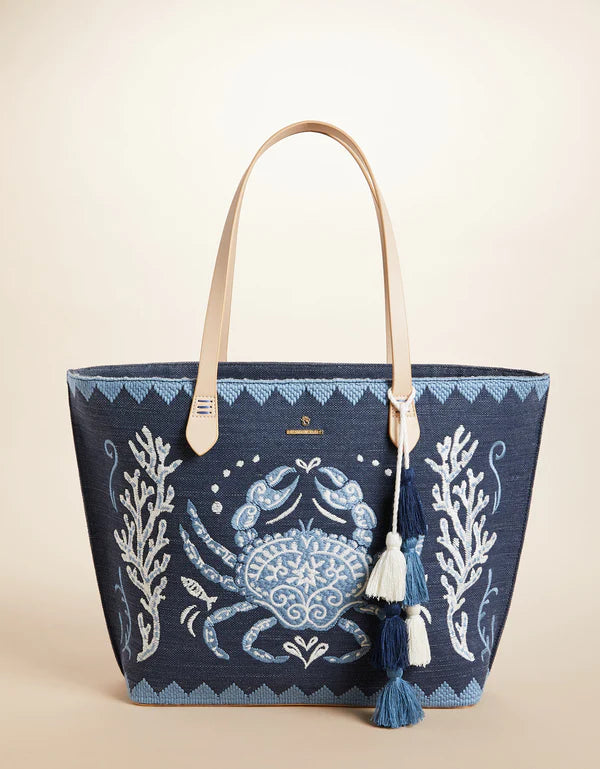 The best party is a beach party and our Fiesta Tote is always ready to come along! Decorated with an embroidered crab on a cotton and jute blend, this tote features a fun, tiered tassel fob and a faux leather bottom base to keep it dry. The custom, crosshatch patterned cotton interior features two slip pockets and one hanging zipper pocket.