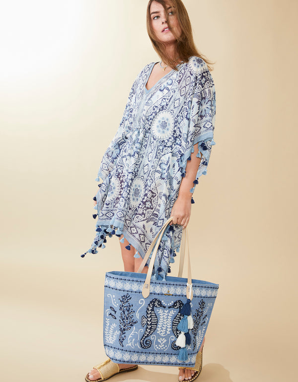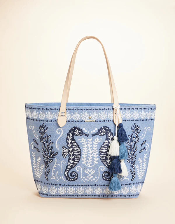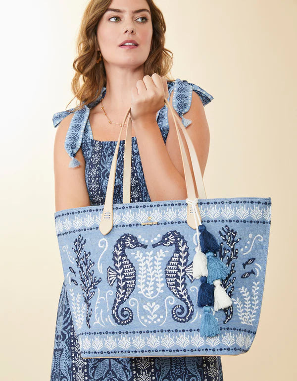 The best party is a beach party and our Fiesta Tote is always ready to come along! Decorated with an embroidered seahorse on a cotton and jute blend, this tote features a fun, tiered tassel fob and a faux leather bottom base to keep it dry. The custom, crosshatch patterned cotton interior features two slip pockets and one hanging zipper pocket.