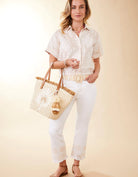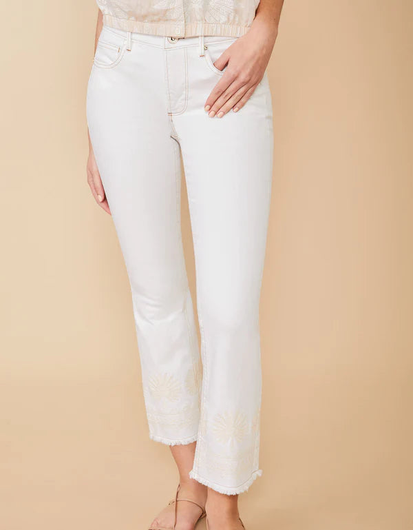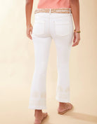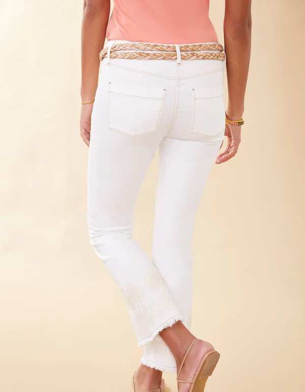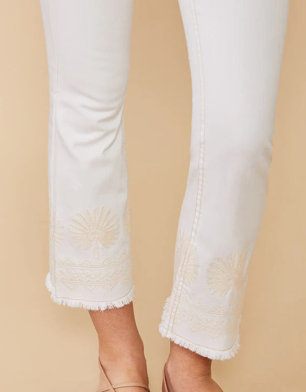 It's your favorite, comfortable denim with a little extra Lowcountry flare: our pearl white Ellington Kick Flare Jean features palmetto embroidery, frayed edges, and front and back pockets in our ultra-stretchy denim that softens with wear for all-day comfort. Style with your favorite Spartina tops to give these jeans a new look with each wear. ** We recommend sizing up at least 2 sizes, as this item runs small.