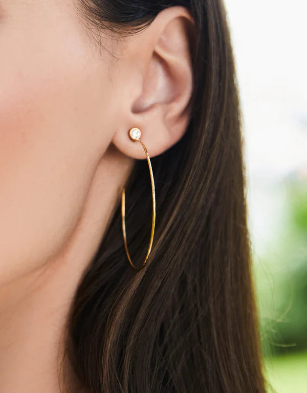 These Ultrathin Hoops are literally ultrathin and featherweight. You will forget you are wearing them! Topped with a little sparkle for added fun. Designed to shine through everyday wear, exercise, showers and a summer at the beach in tarnish-free 14kt gold vacuum plating.