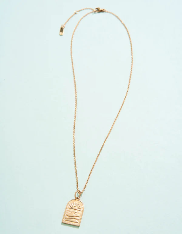 Made of tarnish free, water resistant 14kt shiny gold plating over stainless steel, this Isle of Palms Necklace features a warm, golden palm tree collectible charm with a reversible sun and sea scene. This is a necklace you will never have to take off, designed to shine through everyday wear, exercise, showers and a summer at the beach.
