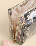 A wipe‑clean cosmetic pouch in Bridge Street Palms Black—pretty pattern, practical design.