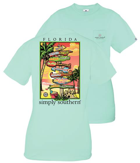 Our exclusive Florida Simply Southern short sleeve shirt featuring our favorite cities including St Augustine, Gainesville, Lake City, Ocala and Jacksonville. On calming ice blue. Only online here and at Artsy ABode locations.