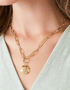 Designed to shine through everyday wear, exercise, showers and a summer at the beach in tarnish free 14kt gold vacuum plating. This textured paperclip chain charm necklace can we worn multiple ways with it's unique hook closure. The built in charm clasps also allows you to take charms on and off. Comes with a summer ready sand dollar charm.