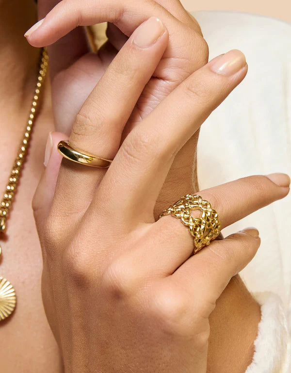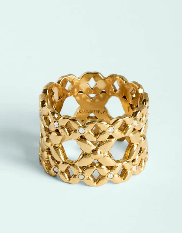 Add sparkle with the Bridge Street Ring, featuring golden latticework and luminous white opal crystal detailing in a refined, everyday design.