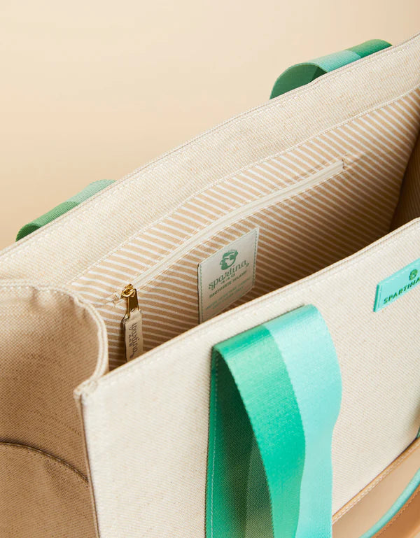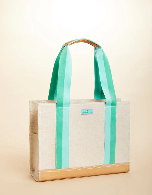 The Armada Tote is made of stain-resistant, laminated cotton and jute, striped in bold webbing, and trimmed in faux leather. Featuring an easy-to-reach back pocket, 2 side pockets, and a convenient open top, this tote will be your most-loved accessory.