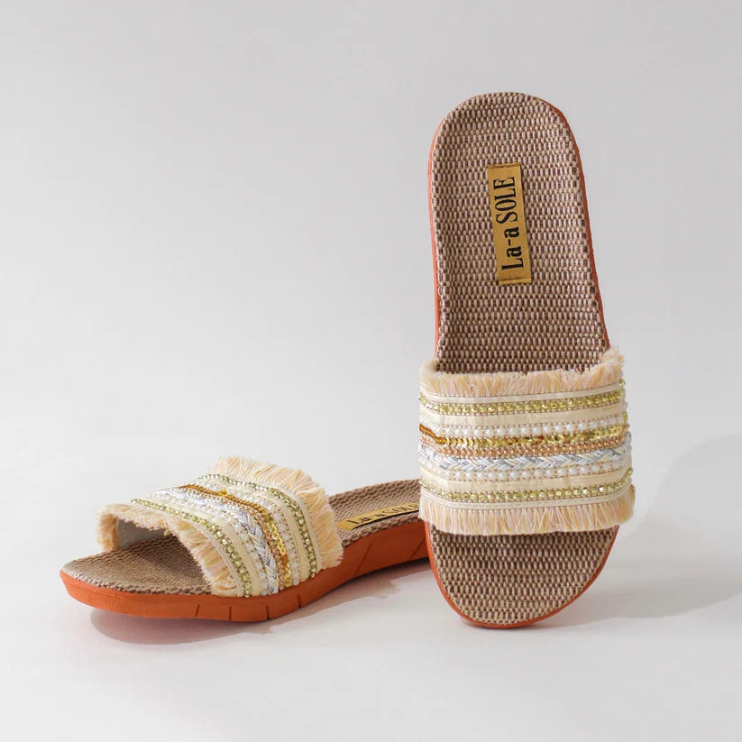 Our Boho slides will have you beach ready and feeling the summer vibes. Extremely comfortable and easy to slip on and off. High quality rubber slip resistant sole with a built in arch for support. The perfect combination of style and comfort!