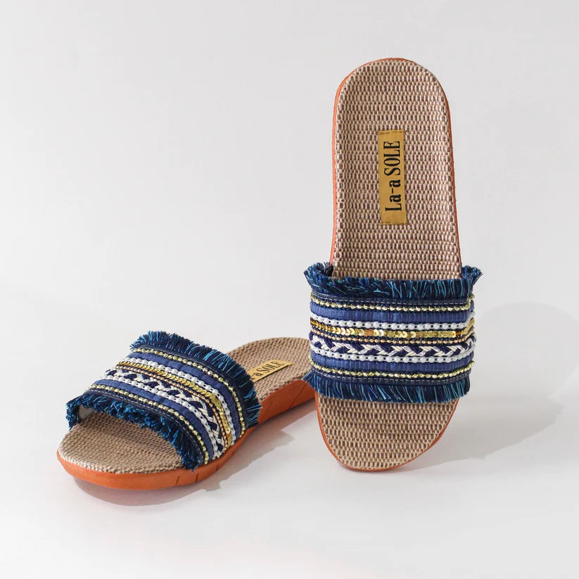 Our Boho slides will have you beach ready and feeling the summer vibes. Extremely comfortable and easy to slip on and off. High quality rubber slip resistant sole with a built in arch for support. The perfect combination of style and comfort!