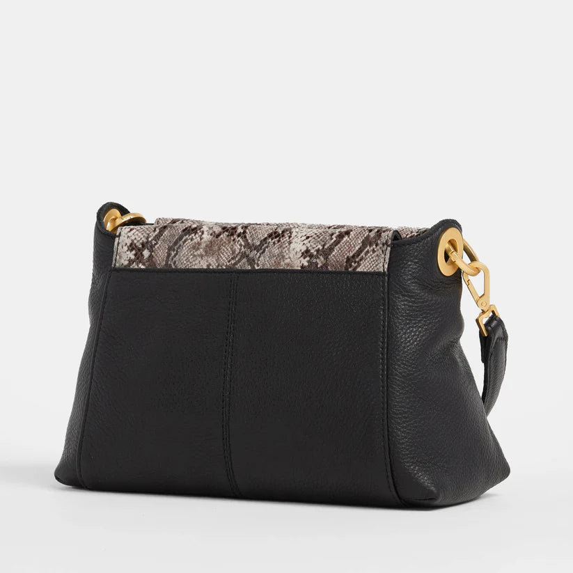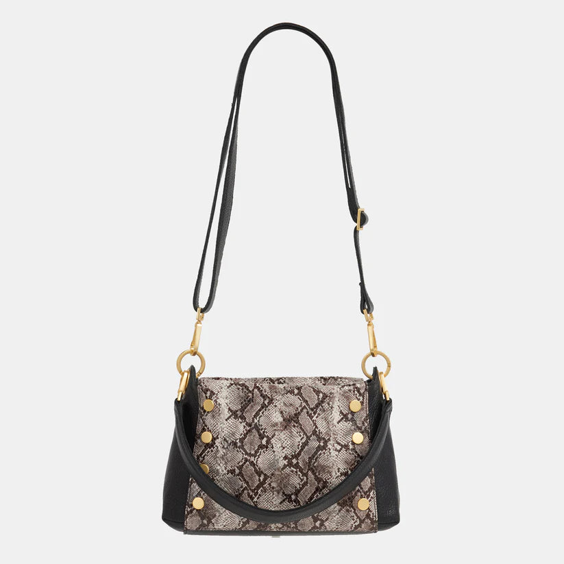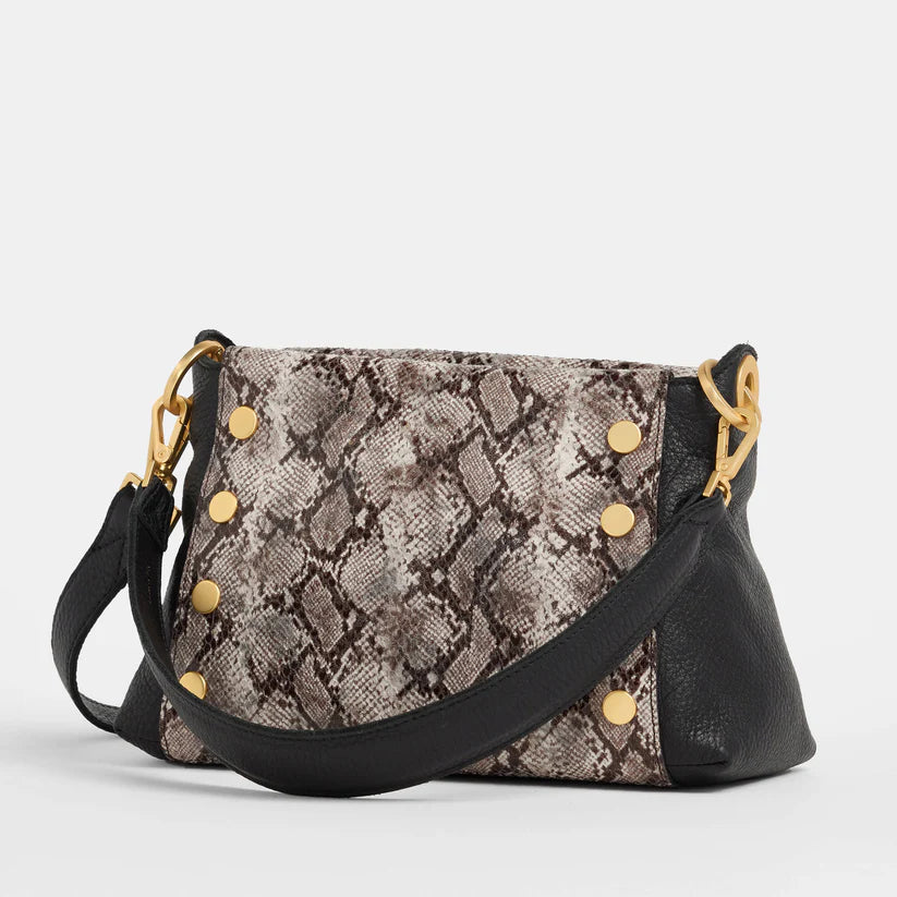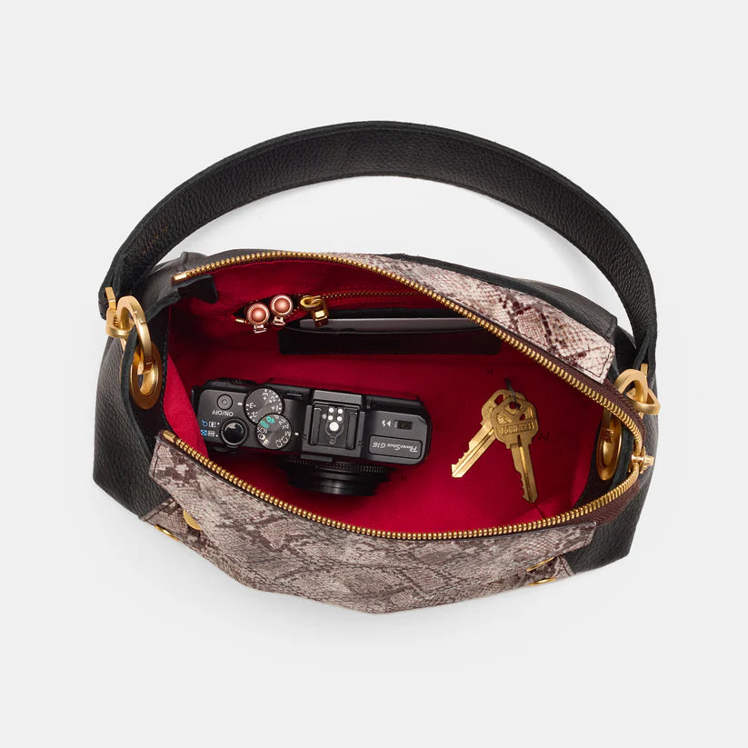 Meet our Bryant medium, a space-efficient style with plenty of room and added accessibility. Our Contrast Snake Collection features Italian leather with snake scales delicately foiled onto a luxurious suede base, creating a fusion of textures that feel soft to the touch. Inspired by light and shadow, this pattern showcases striking contrasts with black, white, and grey hues mixed with deep brown tones, resembling a painter's brush stroke.