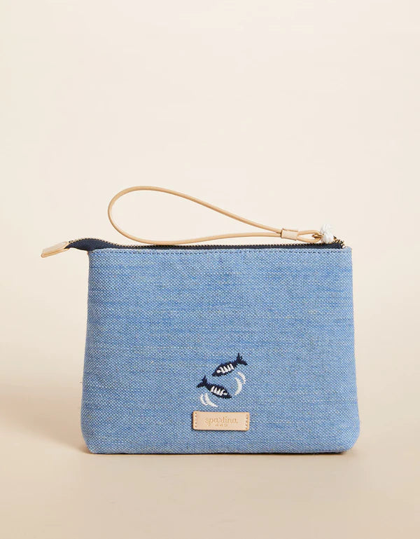 A beautiful sea life scene with seahorse embroidery is just the beginning to our thick, durable cotton and jute Carina Wristlet, which features a faux leather wristlet strap, an easy, zip-top opening, a tiered tassel, plus an interior zip pocket.