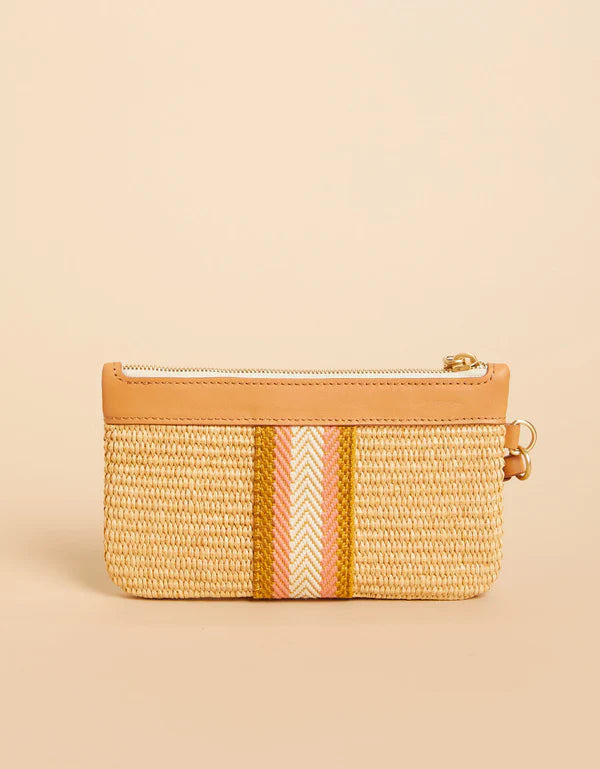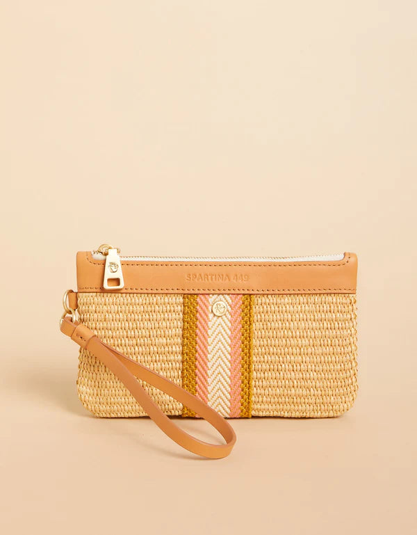 The Charlie Wristlet: made with soft faux straw, striped in bold webbing and trimmed in top grain Napa leather. Made to seamlessly work into your everyday style this wristlet is designed with your on-the go lifestyle in mind! Cash, cards, lipstick, and more-- stuff it all in and grab this wristlet before you go! This handy wristlet will be your new best friend.