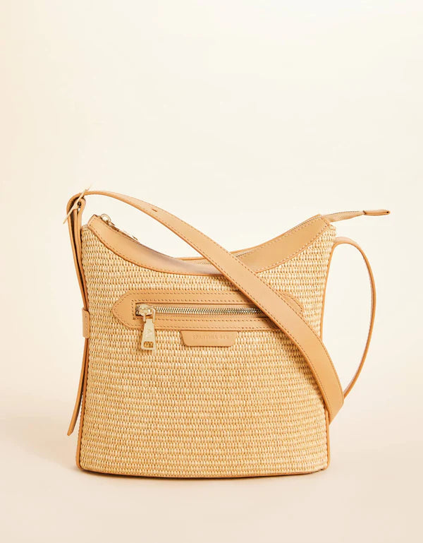 This gorgeous straw transitional piece is complemented by top grain Napa leather. Open the zipper of our Crossbody to 2 slip pockets and 1 zipper pocket. Plus, there is a convenient exterior zipper pocket.