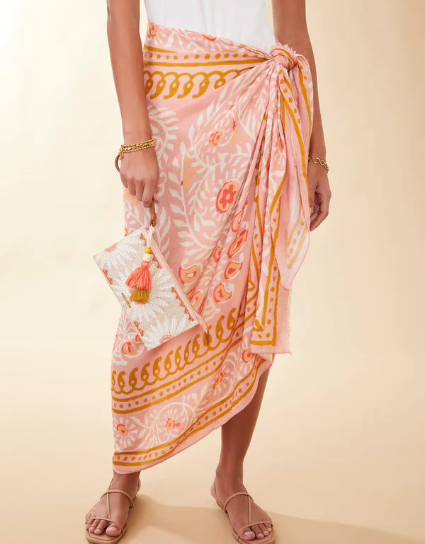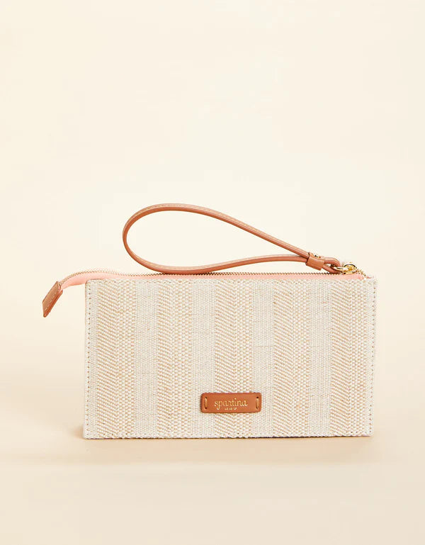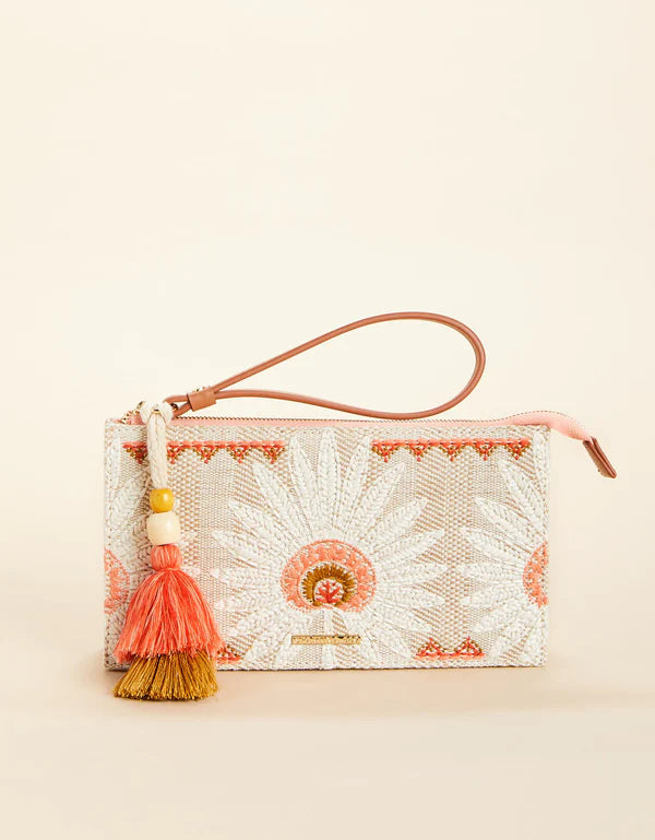 With a slim profile that's sleek and chic, the East West Wristlet is a stylish accompaniment to your resort attire. Outside, its cotton and jute is accented by embroidered palmetto leaves with a two-tiered colorful tassel fob.