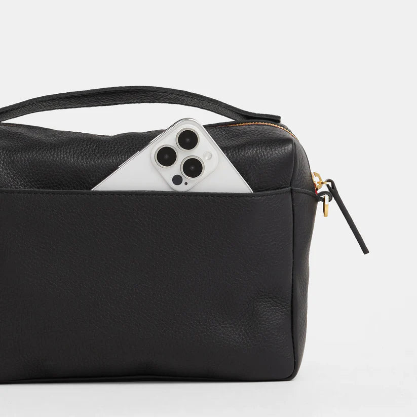 Meet the Evan Crossbody Med, an expanded take on the Evan Crossbody. This refined iteration offers enhanced functionality, featuring an additional interior zip pocket and flat pocket for optimized organization. With the inclusion of a magnetic closure on the cell pocket, this spacious crossbody epitomizes practical sophistication, ideal for everyday use. Crafted with our classic soft black pebbled leather and bold red zipper detailing.