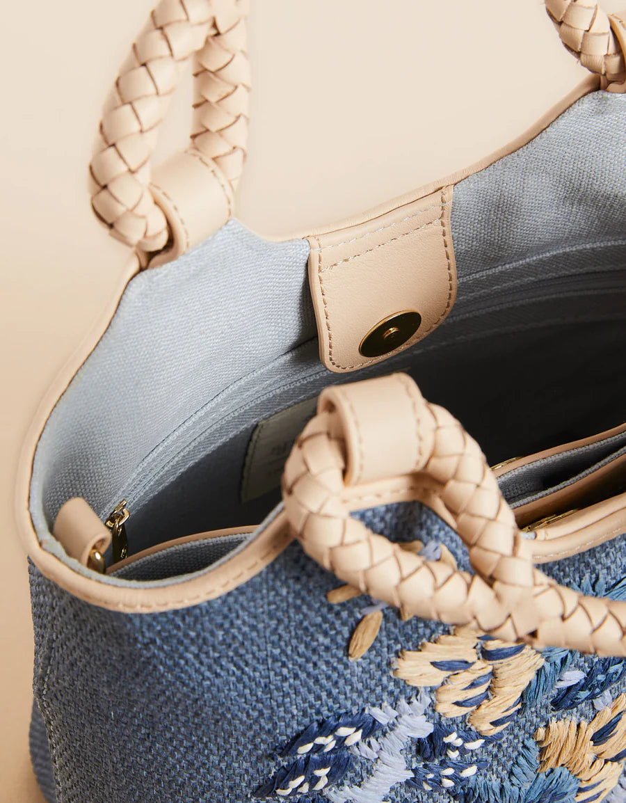 Functionality meets style in our papyrus embroidered woven straw Gita Tote! Store your valuables in the middle zipper compartment and anything you need to grab quickly in the two outside compartments, all snapped together with a magnetic closure. This medium size wonder features a unique wavy structure, a braided woven handle, and an optional crossbody strap.