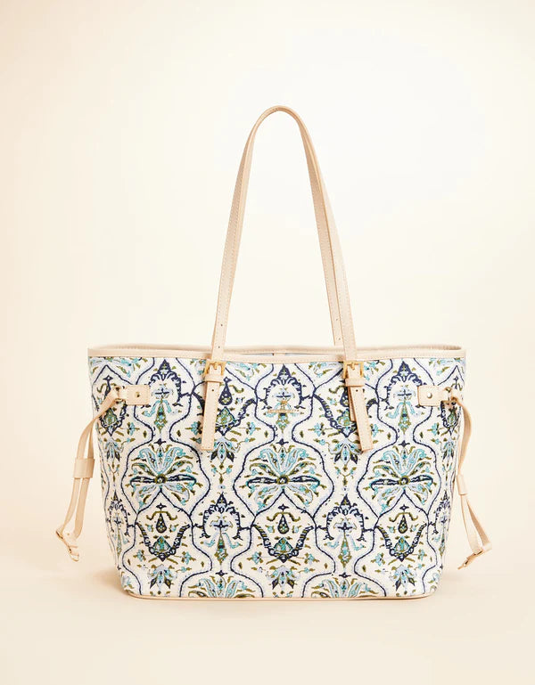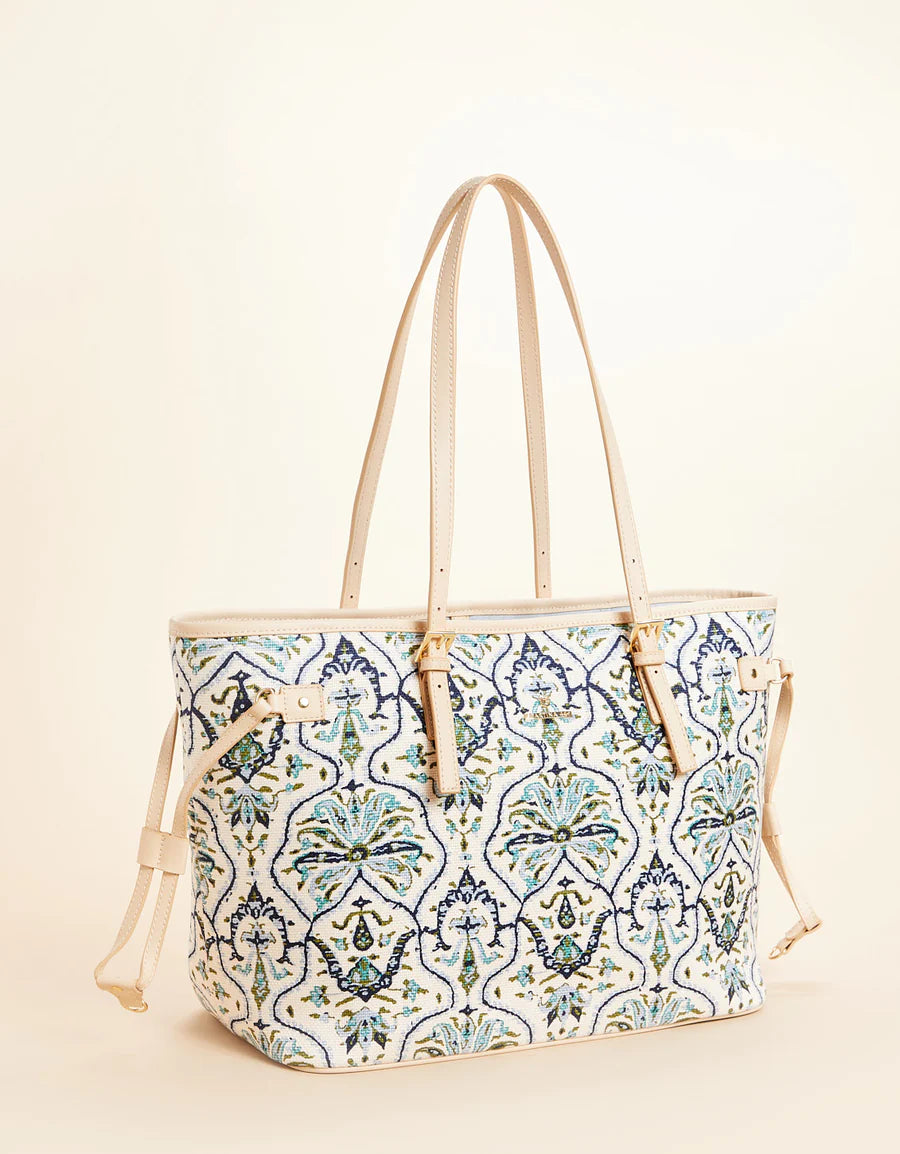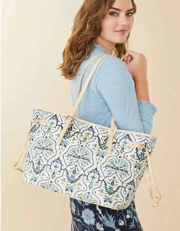 Whether traveling by air, land or sea, this tote will be your favorite new companion. Adjustable side straps allow you to tailor the bag to the size that best suits you. This bag boasts a deep, spacious interior a large zippered pocket on one side and three slip pockets on the other. A beautifully crafted hook closure and signature Spartina mermaid finish the look. Wherever your day takes you, this bag is ready to go!