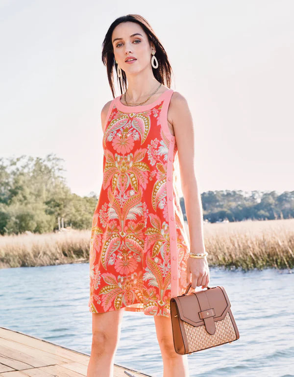 Get resort-ready in a snap with our Madolyn Snap Dress! Made in a soft, comfortable Peruvian cotton blend with convenient snaps at the side seams, the Madolyn will take you from the tiki bar to oceanfront dining. The damask red print, contrast edging details, sleeveless style, and above-the-knee length make this dress a must-have.