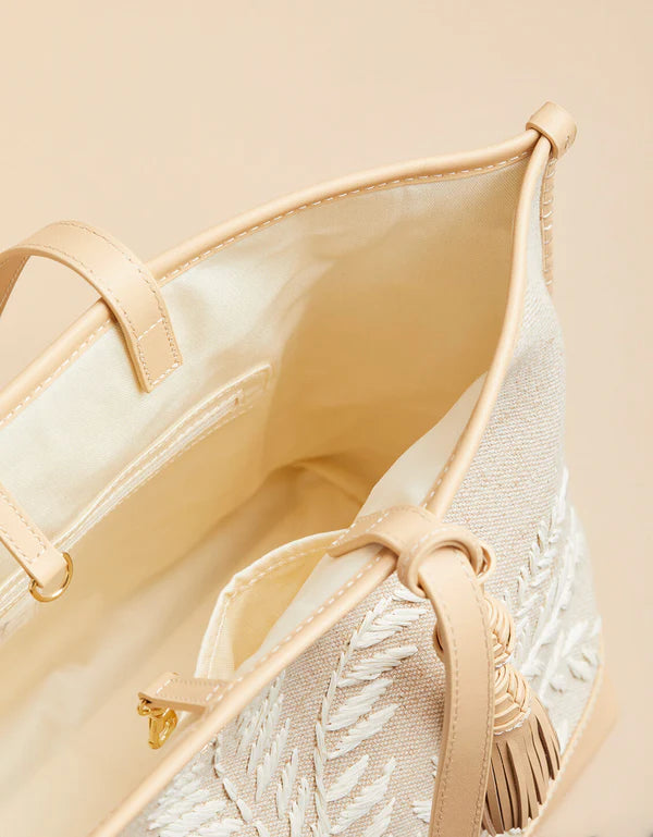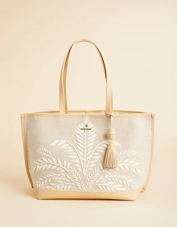 Add style to your work tote with our papyrus embroidered Maya Tote. The roomy interior with zip and slip pockets offer functionality while the palm reed pattern and leather tassel really show off.