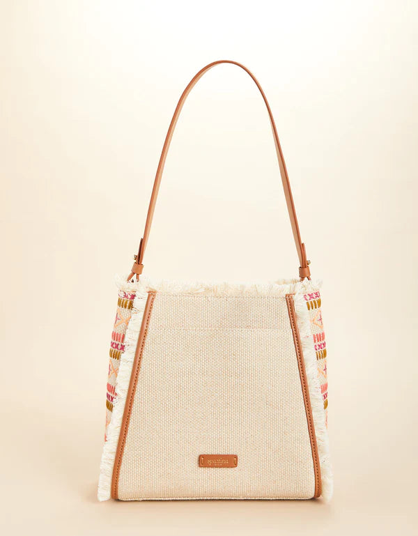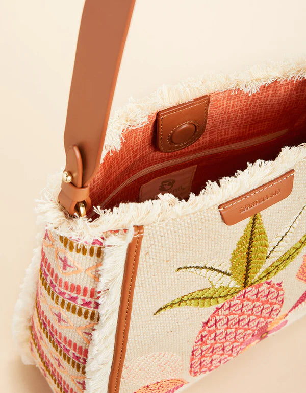 Need something functional and stylish? Our Melody Bucket has you covered in a pineapple embroidered cotton and jute! With a roomy interior and three inside pockets secured by a magnetic closure, you can throw and go.