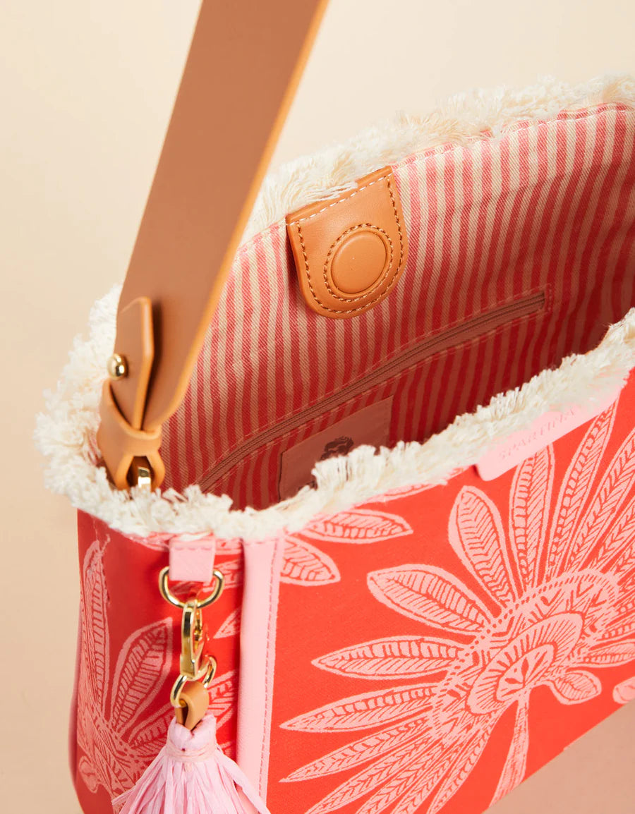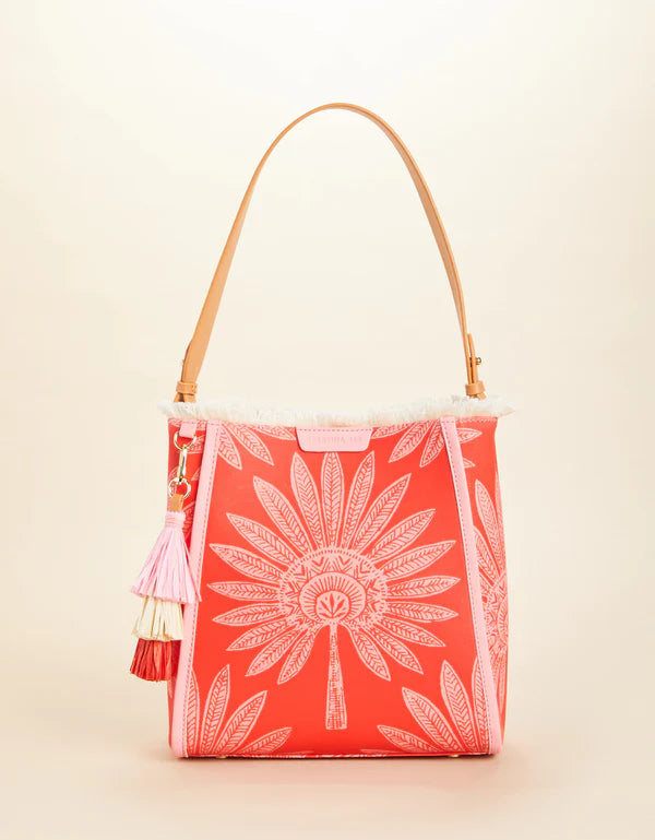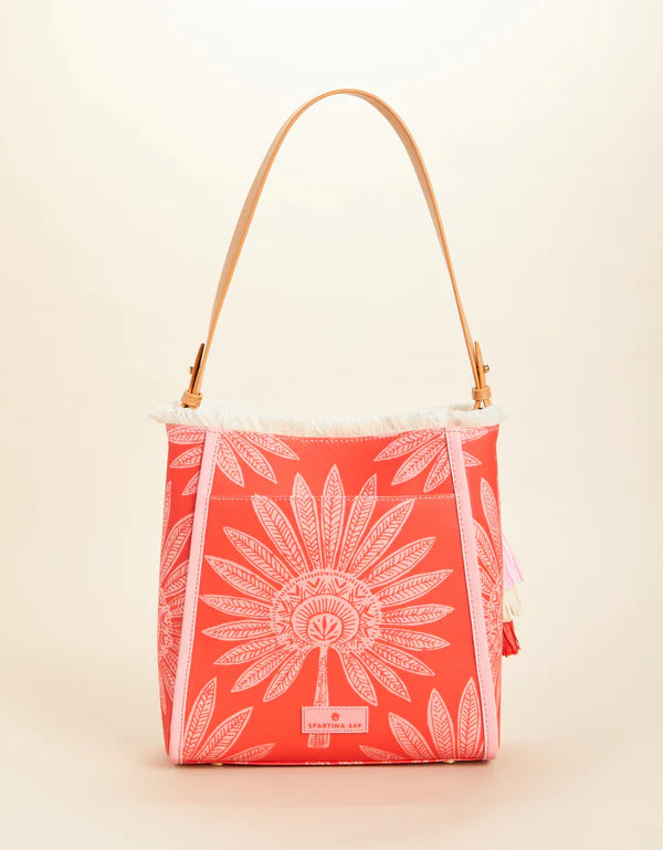 Need something functional and stylish? Our Melody Bucket has you covered in a palmetto patterned laminated cotton! With a roomy interior and three inside pockets secured by a magnetic closure, you can throw and go.