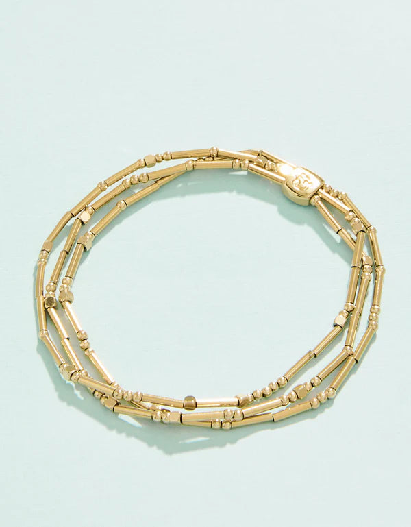 You will be enchanted by three layers of mermazing tiny metal beads in this easy-on stretch bracelet. Designed to shine through everyday wear, exercise, showers and a summer at the beach in tarnish free 14kt gold vacuum plating.