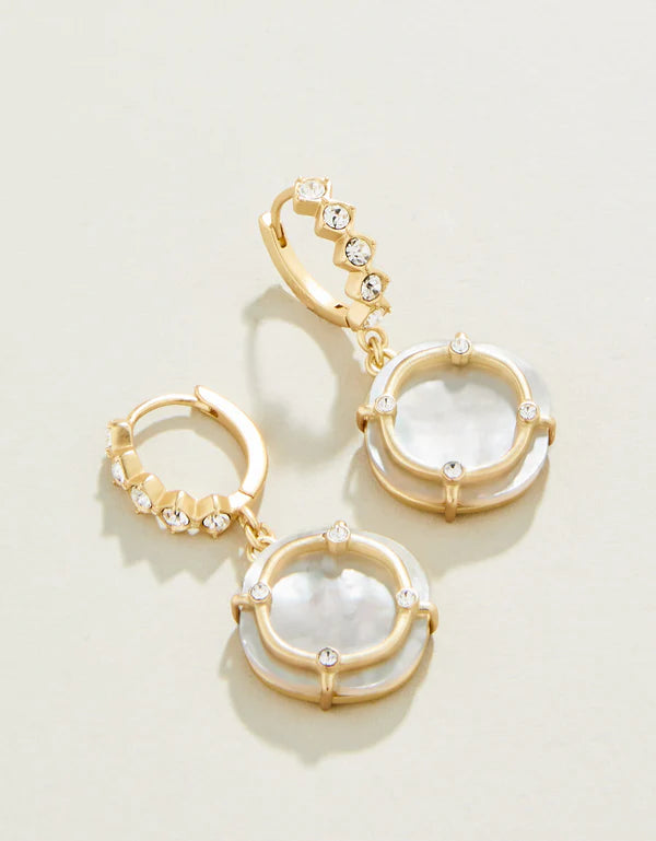 Our Orla Round Drop Earrings feature intricately framed shimmering mother-of-pearl drops on 18kt matte gold plated glass crystal hinged hoops. Simply beautiful with any outfit. A classic you will be pulling out of your jewelry case again and again.
