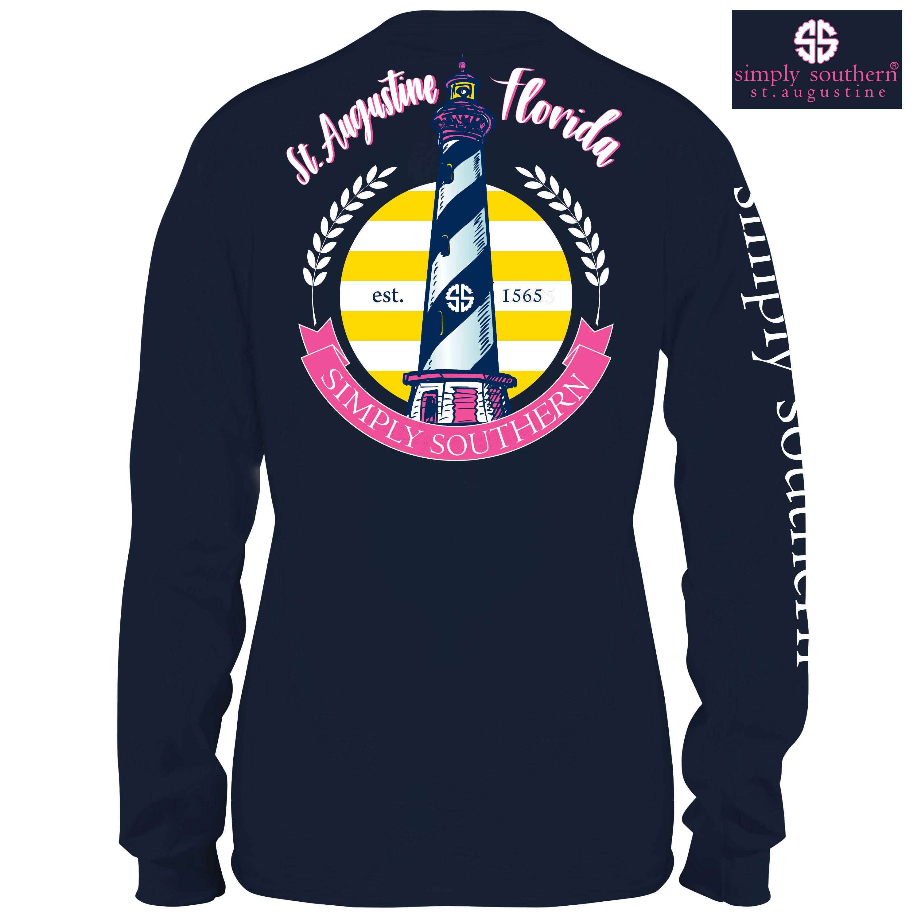 Shop our exclusive collection of custom Simply Southern St Augustine shirts. Commerate your visit to the nations oldest city with an exclusive Simply Southern design. This shirt features wording the famous St Augustine Lighhouse in midnight blue.