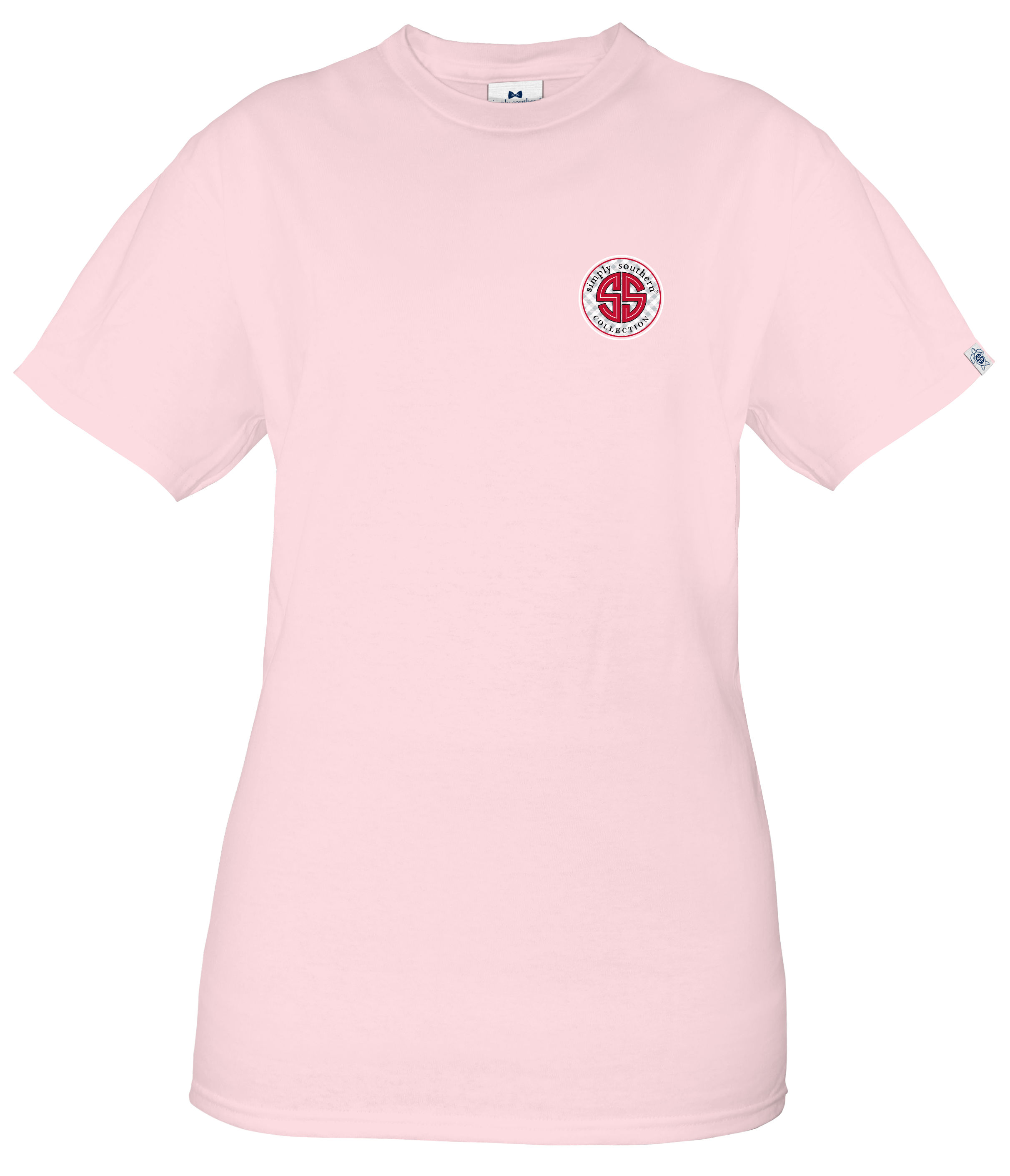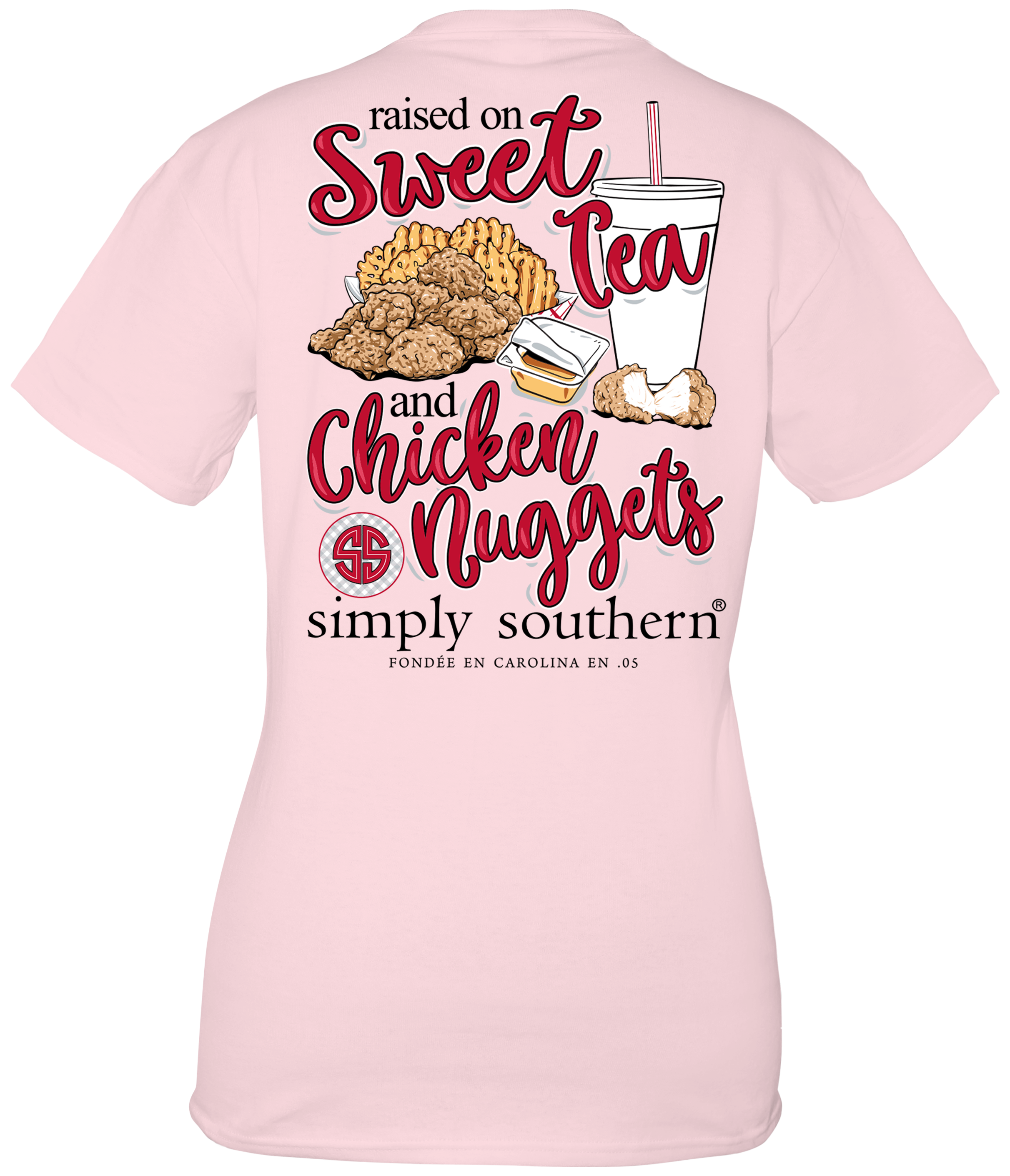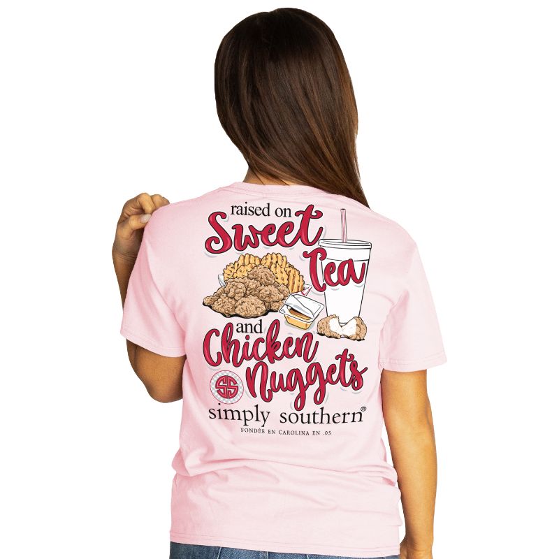 Lulu light pink short sleeve shirt with chicken nuggets; fries; and a drink and "Raised on waffle fries and chicken nuggets" on the front. Small round Simply Southern logo on the front chest. Pre-shrunk and ring-spun 100% cotton with ribbed crew neckline. Unisex sizing.
