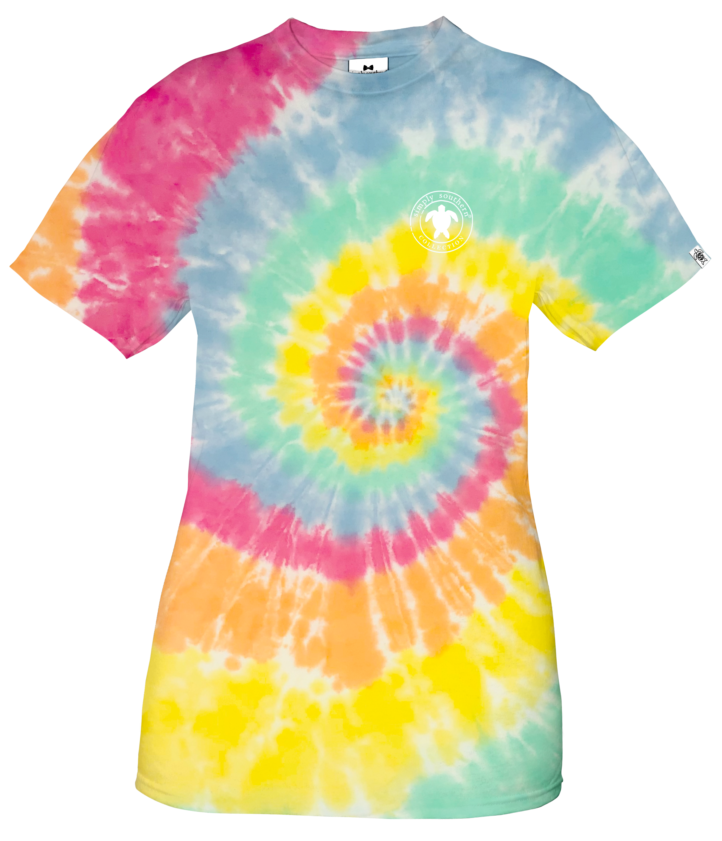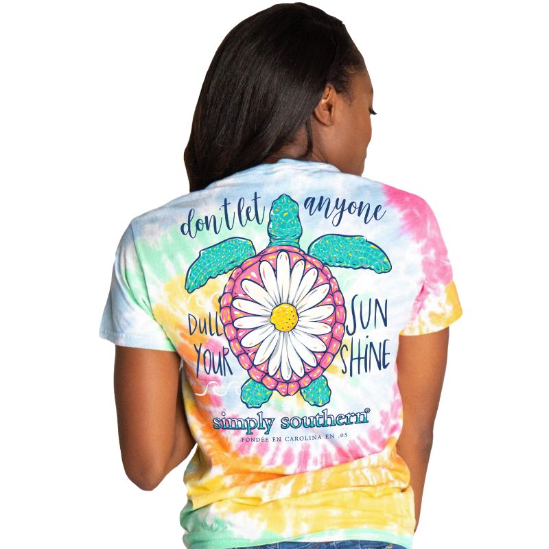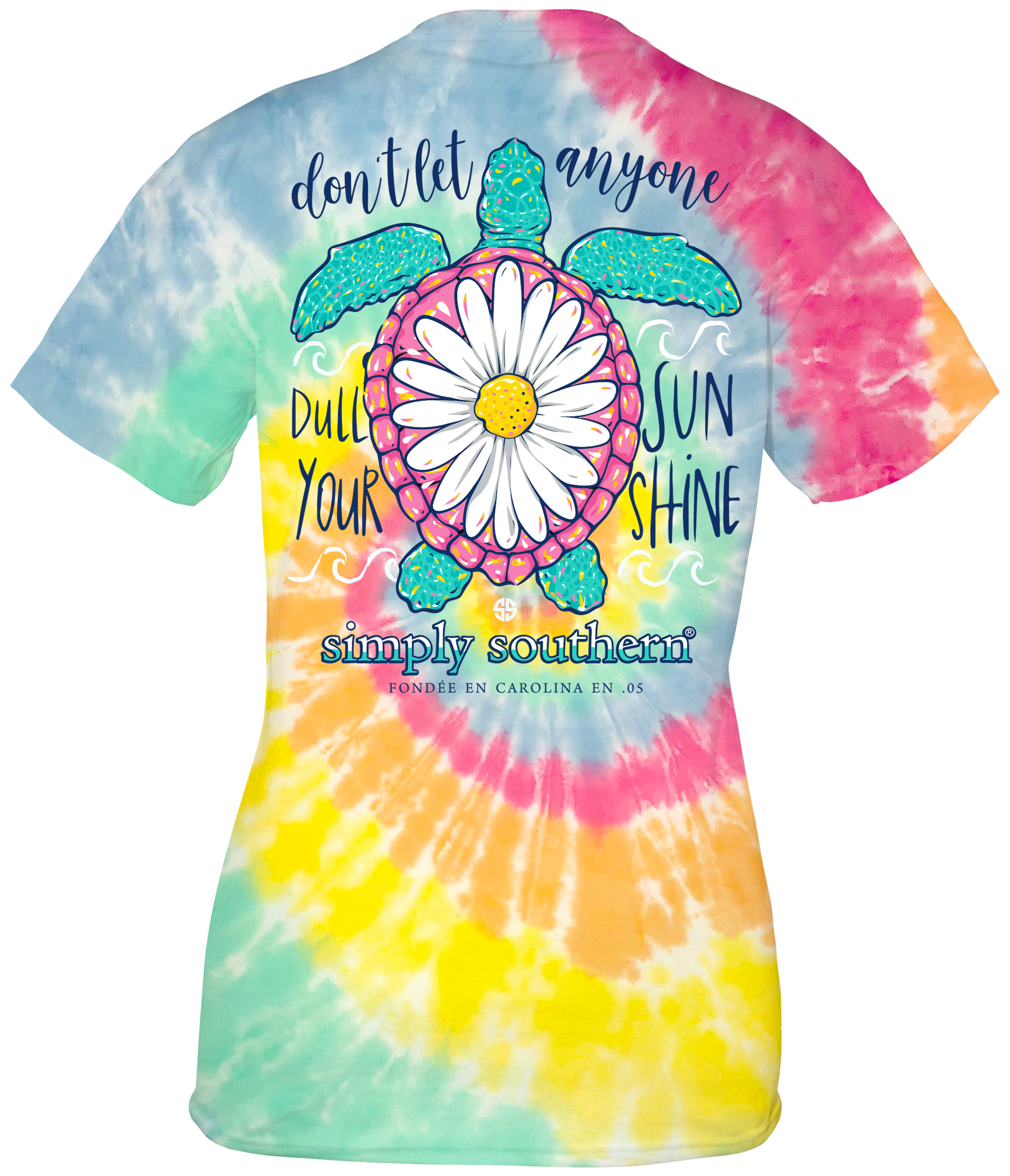 Multicolor swirl tie dye short sleeve shirt with a turtle and daisy design and "Don't let anyone dull your sunshine" on the back. Small Simply Southern turtle round logo on the front chest. Pre-shrunk and ring-spun 100% cotton with ribbed crew neckline. Unisex sizing.