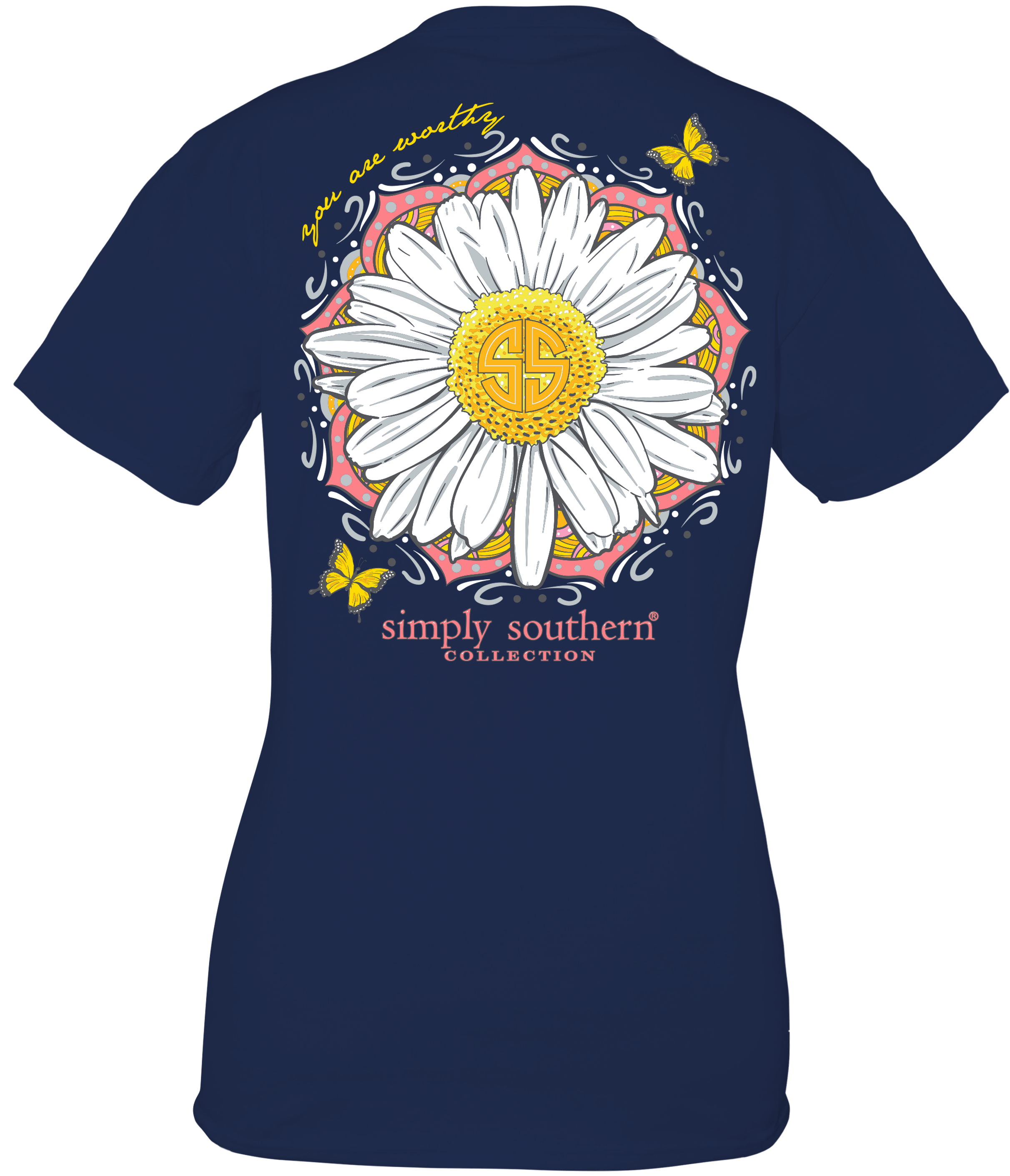 Midnight blue short sleeve shirt with daisy and butterflies and "you are worthy" on the front. Small Simply Southern round logo on the front chest. Pre-shrunk and ring-spun 100% cotton with ribbed crew neckline. Unisex sizing.