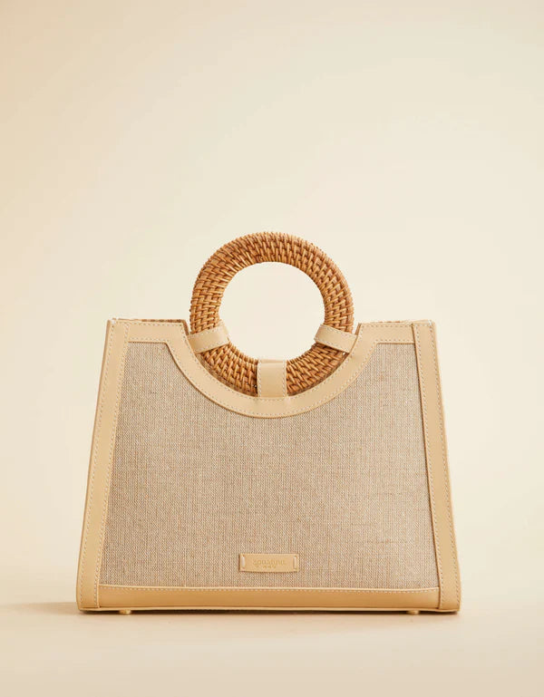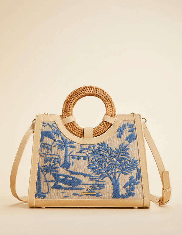 A classic, structured satchel? With modern details? it's all here in our Straw Sienna Satchel. It is both darling as a handheld with a round wicker handle or a crossbody in Napa leather and papyrus embroidered cotton and jute. This seascape scene satchel was made to go from downtown to the coast coordinating with your relaxed resort style.