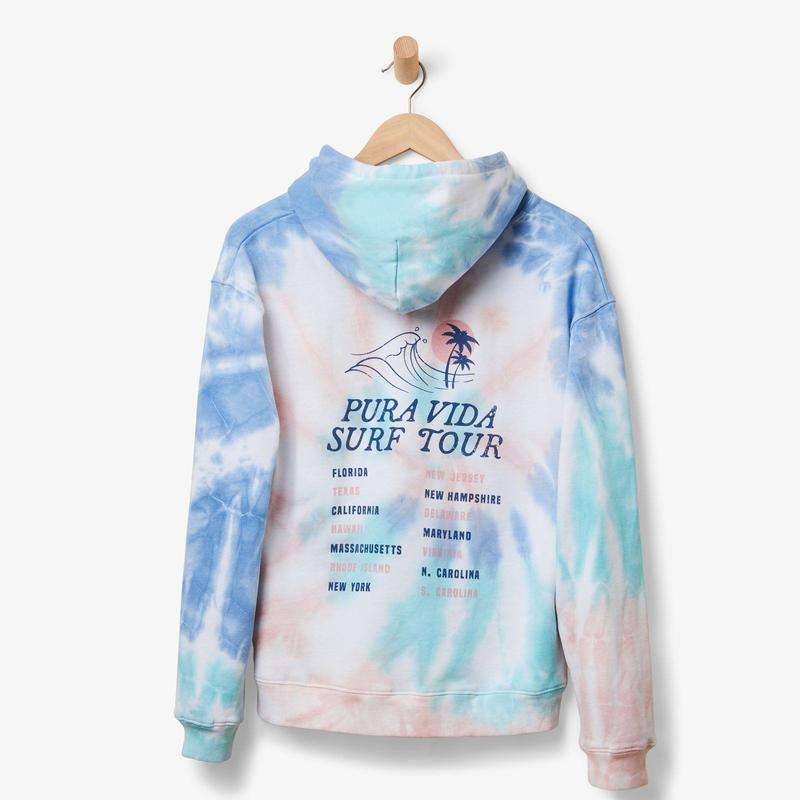 It doesn’t get much sweeter than this cotton candy tie dye hoodie! Our Surf Tour Hoodie has major throwback feels with a tour design on the back in our famous Pura Vida colors - teal and pink and a distressed tropical logo! This classic hoodie will shrink in all the right places for a perfect fit when you wash it!