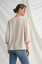 This top combines elevated detail with everyday wearability. The colorful trim gives it a playful pop, while the neutral oatmeal base makes it easy to pair with jeans, skirts, or trousers. Perfect for dressing up or keeping casual.